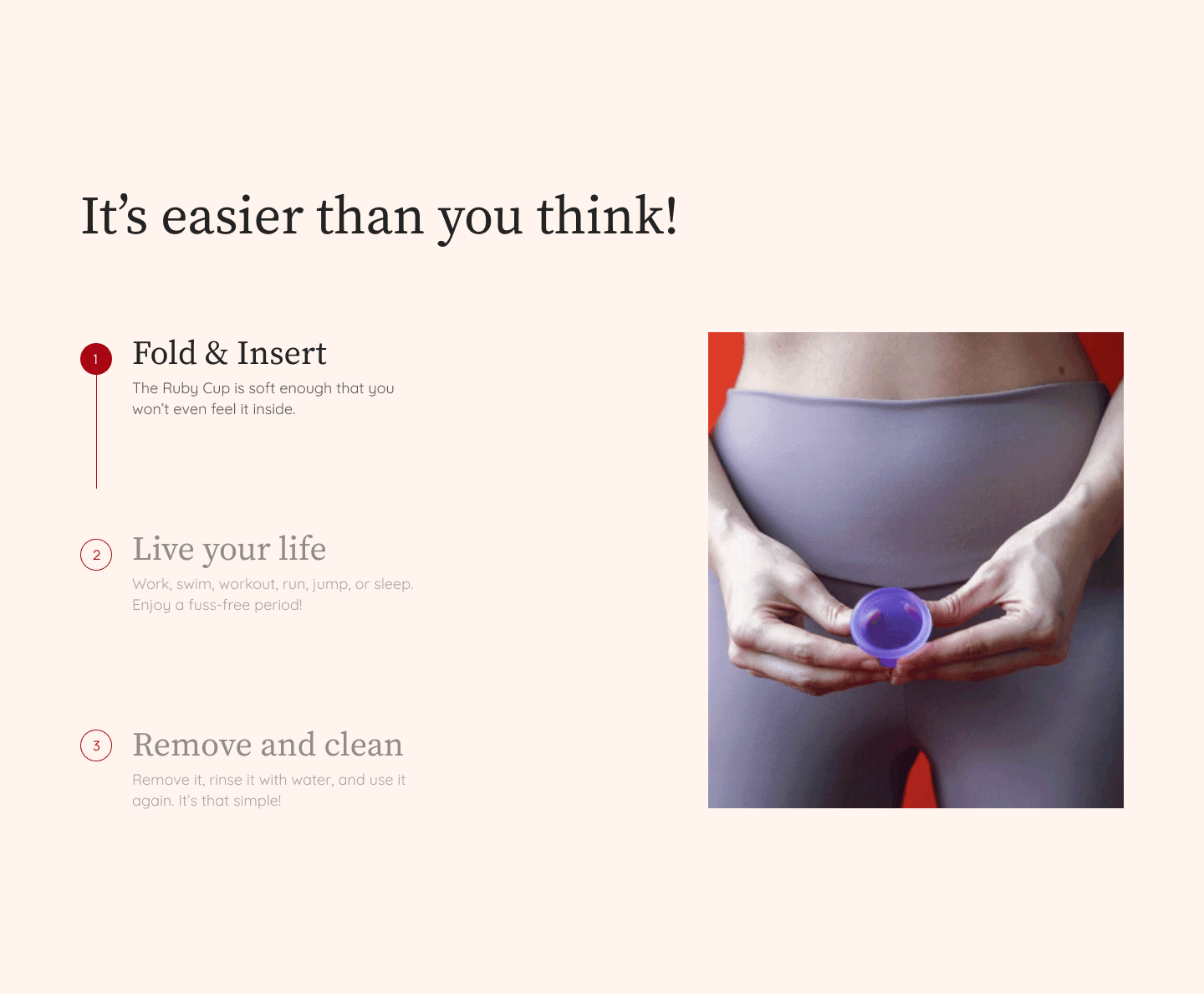 The site lacks a humanizing factor real stories, testimonials, community involvement, or relatable imagery especially important when dealing with intimate products like menstrual cups.