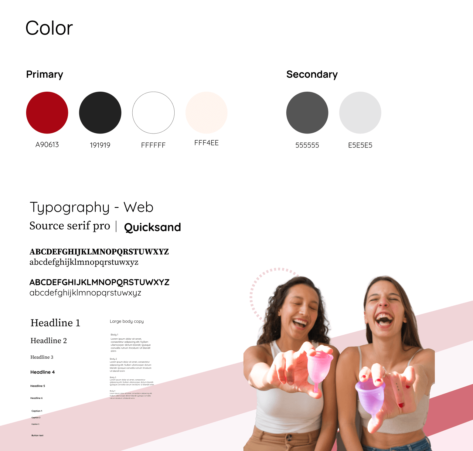 The existing branding was too harsh, with an overwhelming use of red, which is often associated with the pain and blood flow women experience during their period. To avoid evoking these uncomfortable feelings, we chose to use softer colors and a gentler branding approach.
